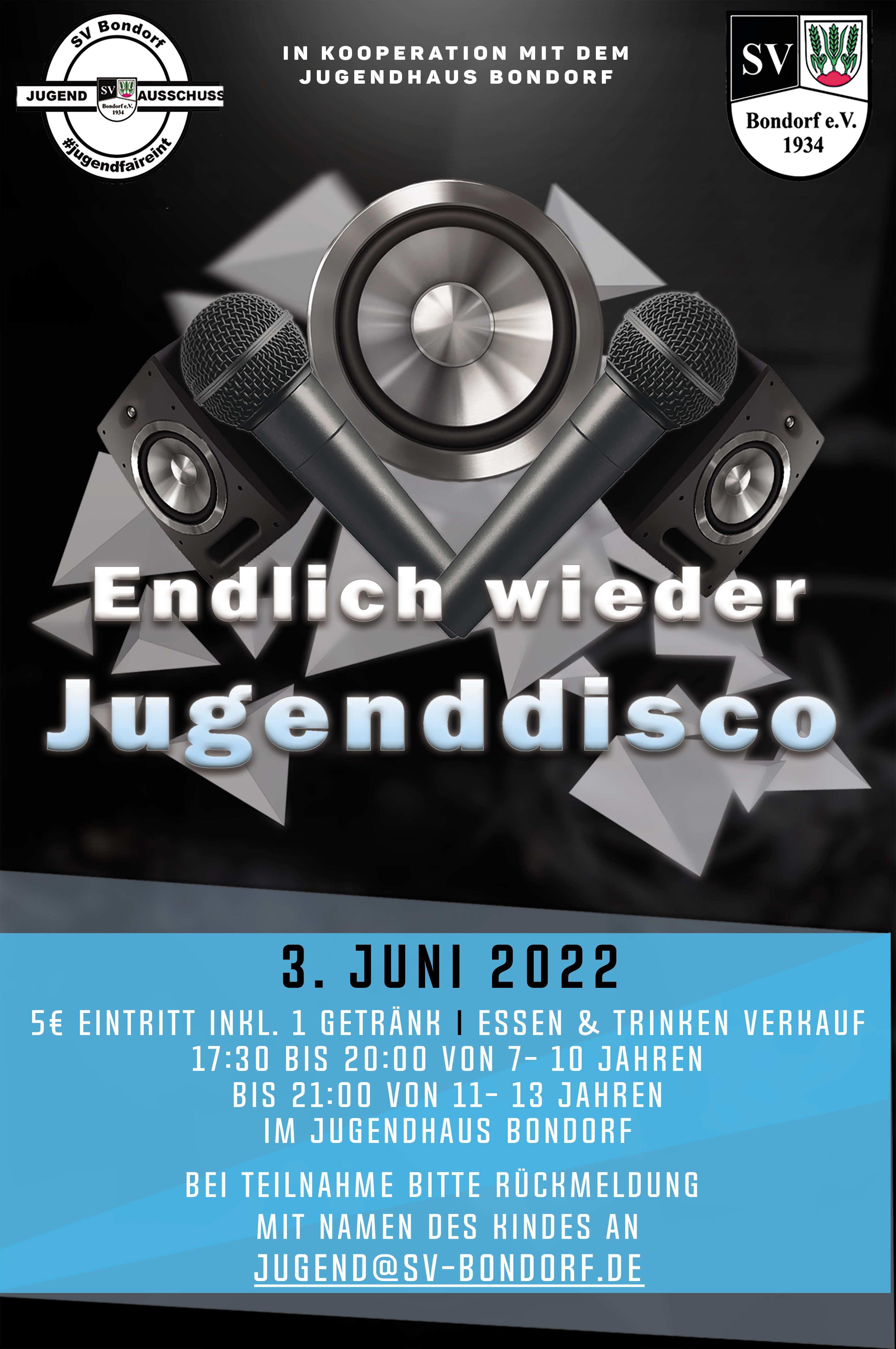 Am 16. Mai findet wieder eine Jugenddisco statt! Alle von 8-15 Jahre sind eingeladen, wir freuen uns auf euch.