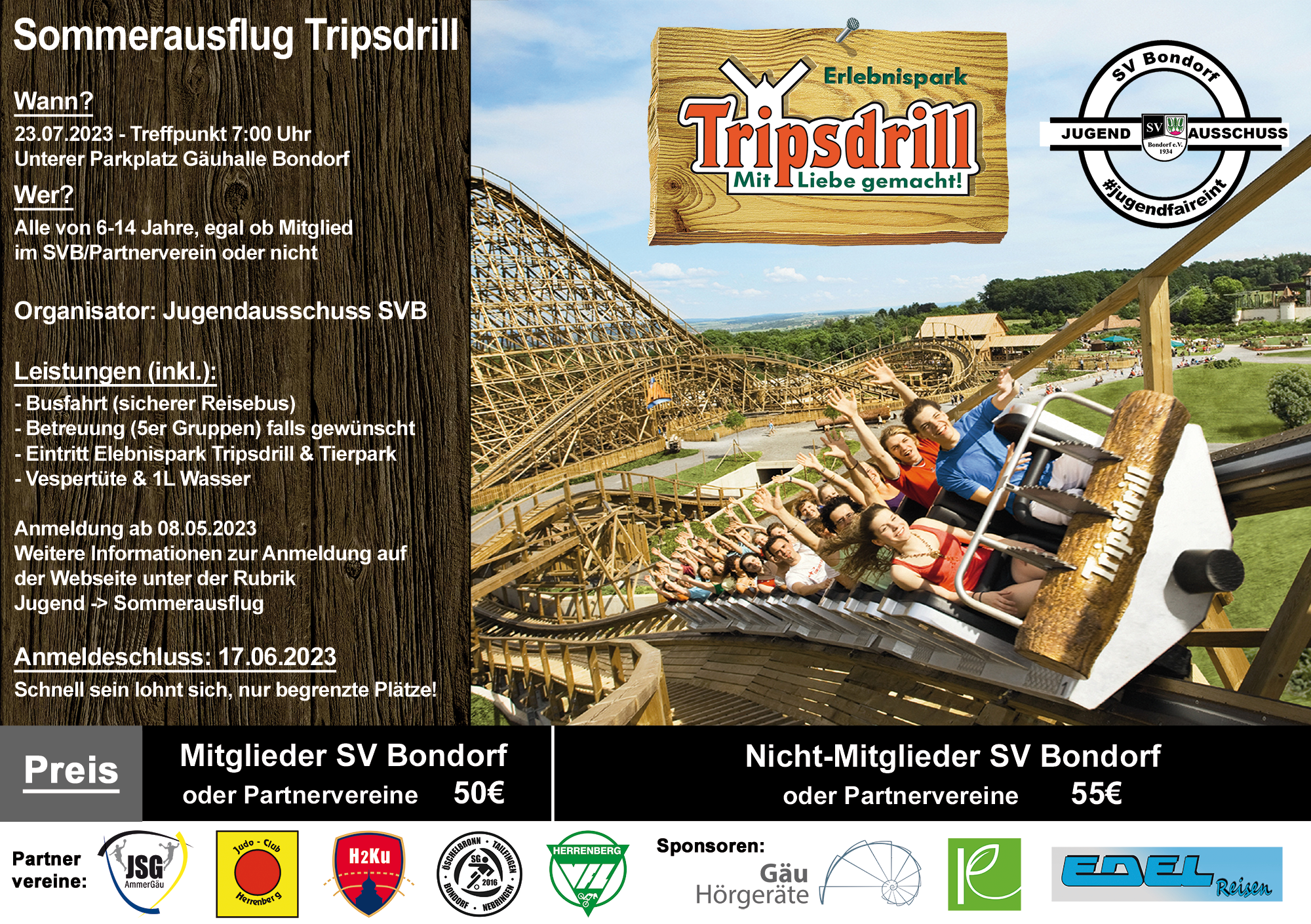 Der diesjährige Sommer-Ausflug der Jugend fährt nach Tripsdrill! Wir freuen uns, euch wieder ein Angebot als Tagesausflug zur Verfügung zu stellen. Der Jugendausschuss wird dabei einen gesamten Tag alles organisieren. Von der Fahrt, der Betreuung bis hin zum Freizeitprgramm im Freizeitpark.